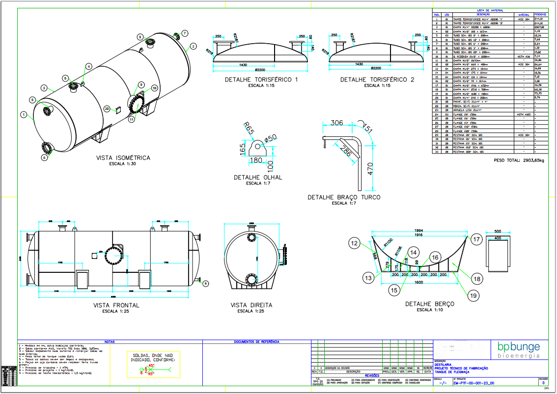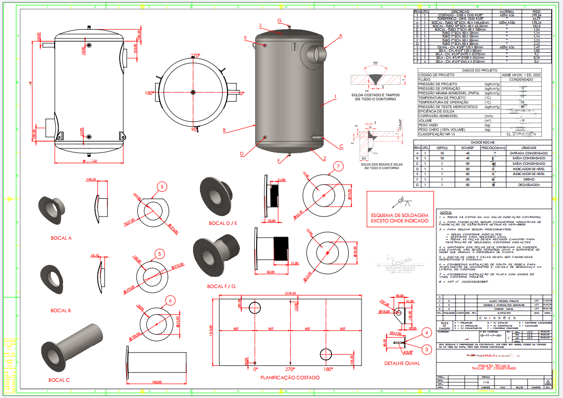 Projeto completo de vaso de pressão conforme NR-13, acompanhado de memorial de cálculo, plano de inspeção e testes, dimensionamentos de soldas para Raizen